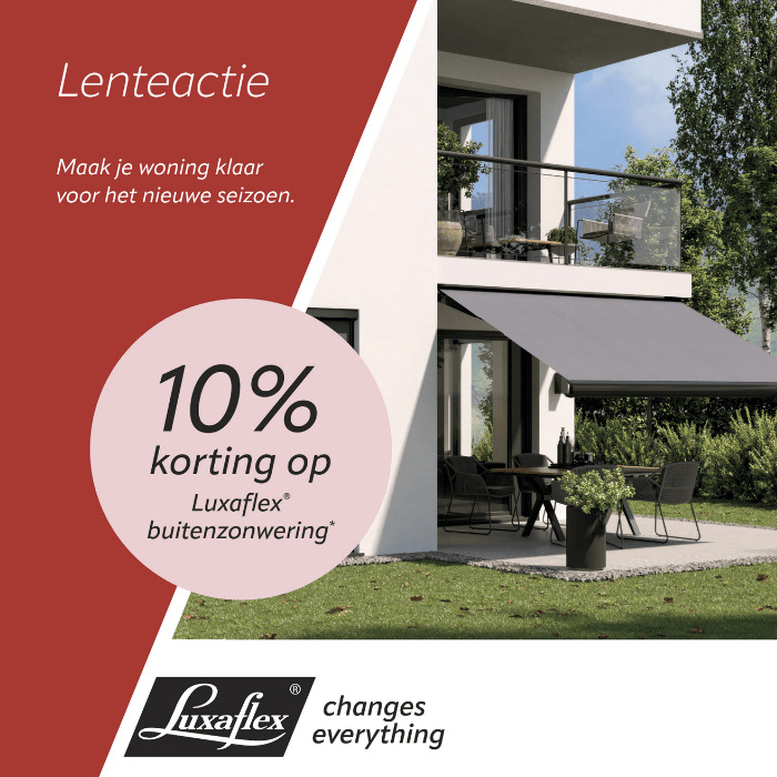 Wij trappen de lente af met een aantrekkelijke consumentenactie op een selectie uit ons assortiment . Met deze promotie bieden we consumenten een mooie korting op producten die speciaal zijn ontworpen om hun woning koel en comfortabel te houden, optimale lichtcontrole te bieden en het huis klaar te maken voor de warmere maanden. Een aantrekkelijke actie voor de consument en extra verkoopkansen voor jou! Concreet betekent dit dat consumenten tot 20% korting ontvangen op geselecteerde indoor producten en 10% korting op geselecteerde outdoor producten.